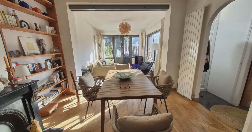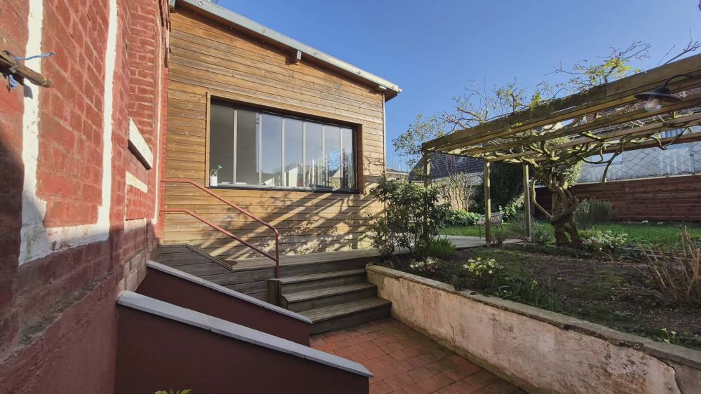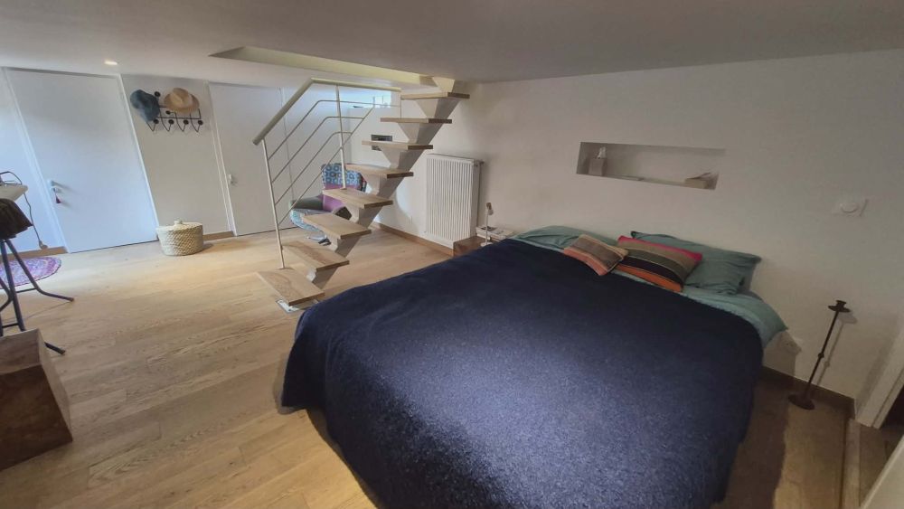 Maison atypique d'environ 70m² habitables avec jardin clos et ensolleillé : entrée, séjour 33m², belle cuisine aménagée, 2 chambres, suite parentale (chambre, rangements, salle de douche, WC), salle de douche avec water-closet.